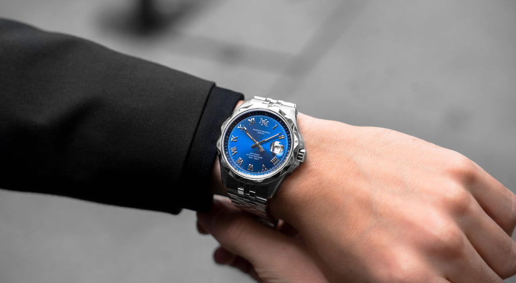 La MM24-04 se distingue par sa lunette facettée aux arêtes sculptées. Son cadran bleu soleillé, animé de chiffres romains argentés et d’aiguilles fines, mêle élégance et modernité. Le tout est sublimé par un bracelet jubilé en acier, raffiné et confortable.