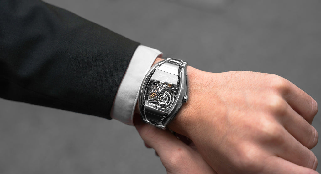 La MM24-05 se distingue par un biseau fuyant qui naît du verre saphir et se prolonge harmonieusement sur chacun des maillons du bracelet, créant une ligne dynamique et continue. Chaque élément du boîtier et du bracelet alterne entre finitions brossées, polies et microbillées, jouant avec la lumière pour sublimer les volumes. Son cadran architectural, travaillé en profondeur, révèle une superposition de textures et de finitions qui renforcent son caractère technique et raffiné.