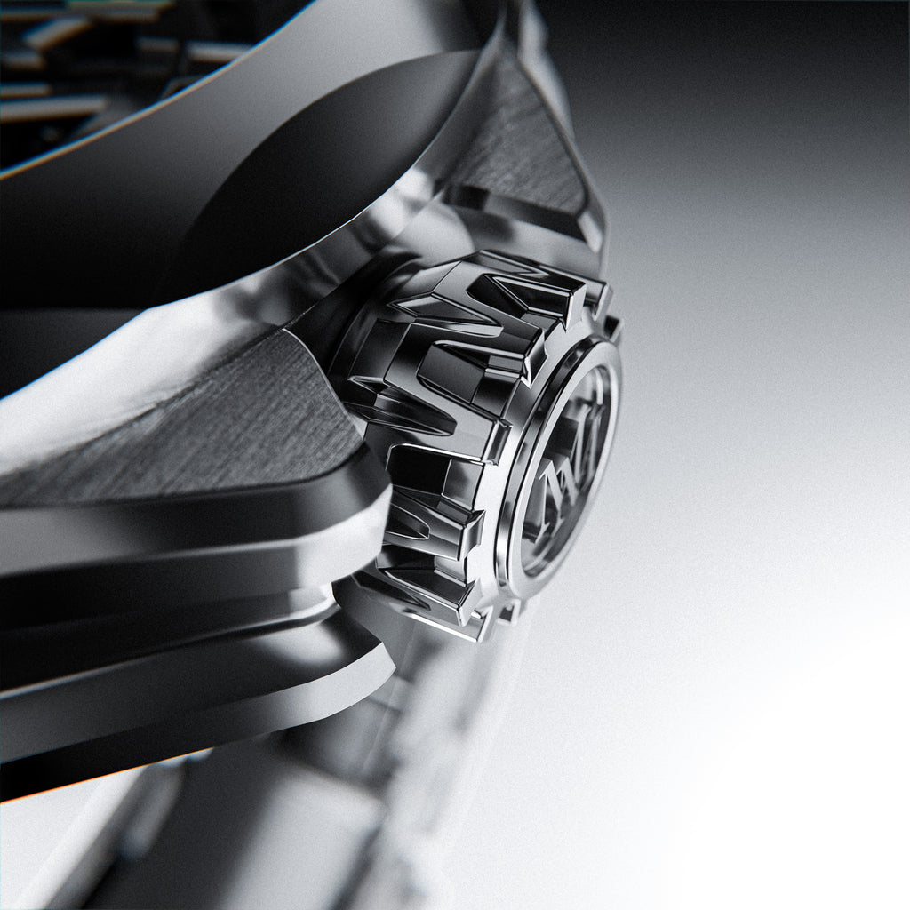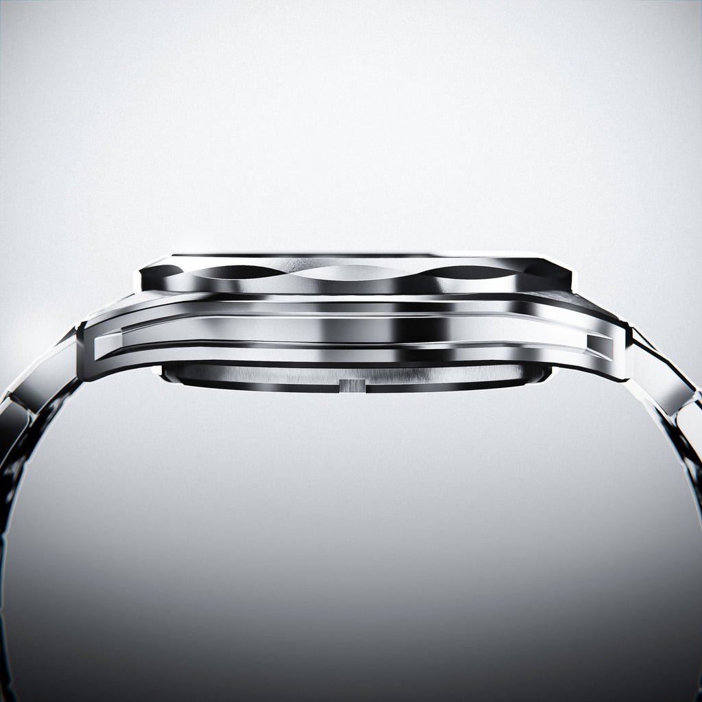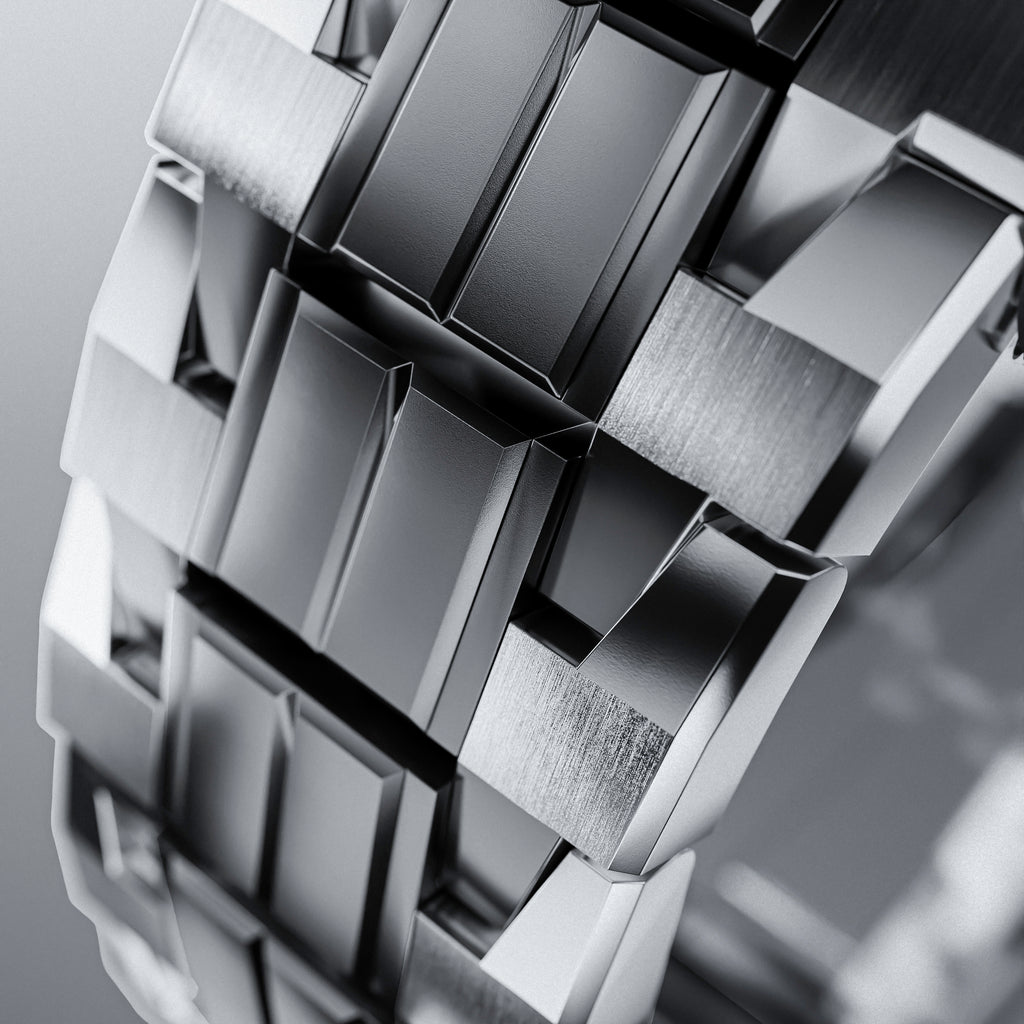 Triomphe incarne une maîtrise technique, sublimée par des formes architecturales affirmées, aussi bien dans la structure du boîtier que dans la construction du cadran. Ses maillons intègrent un centre en tungstène, matière ultra-dense et résistante, usinée puis biseautée avec une précision millimétrique. Les index sont incrustés de polycristallin — une poudre de diamant — dont les reflets profonds révèlent toute la richesse du travail de lumière.