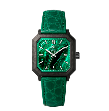 Le cadran de Octa est façonné en malachite naturelle, une pierre précieuse reconnue pour ses veines uniques et ses nuances vibrantes de vert. Chaque pièce est donc absolument unique, avec des nervures singulière sur chacun des cadrans.