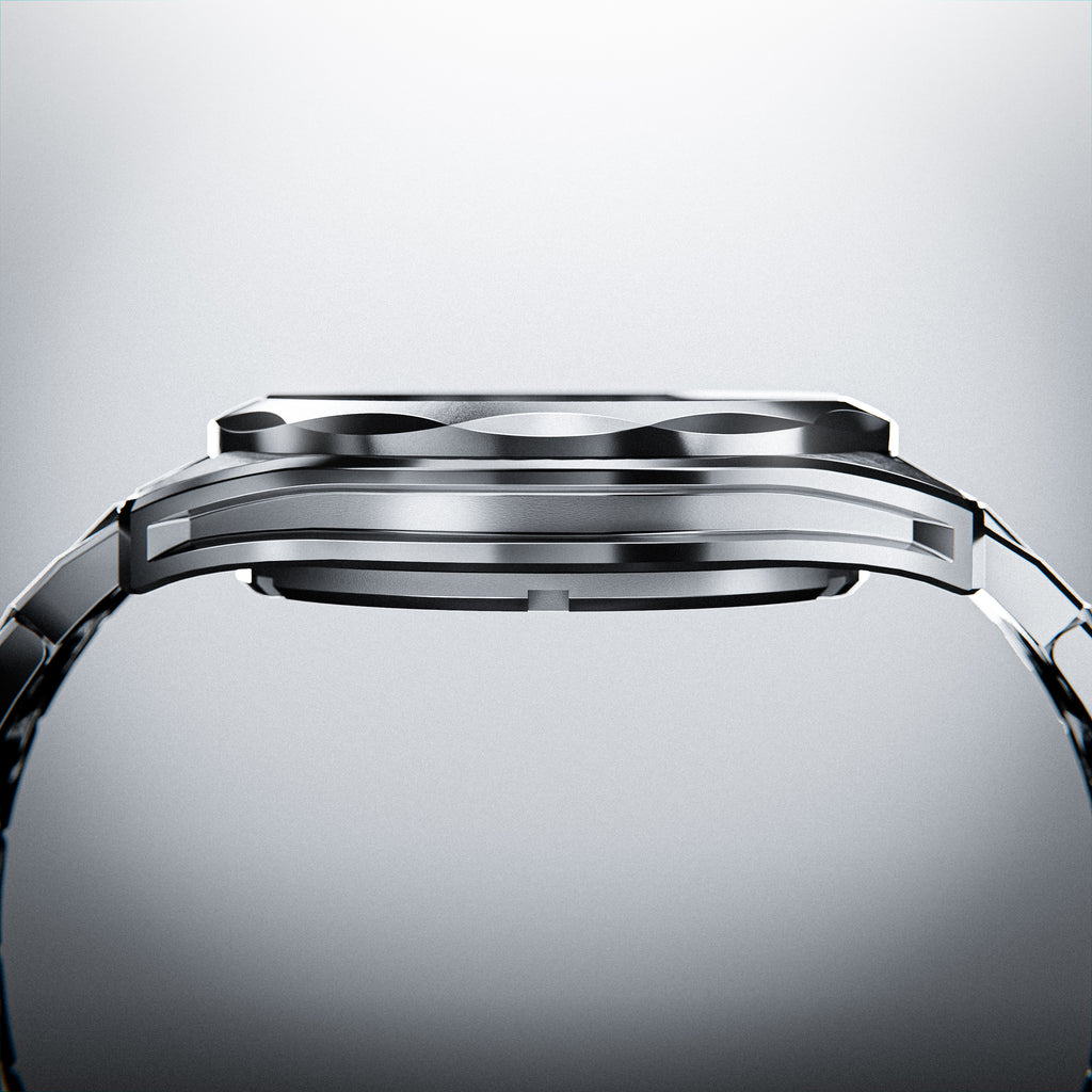 Triomphe incarne une maîtrise technique, sublimée par des formes architecturales affirmées, aussi bien dans la structure du boîtier que dans la construction du cadran. Ses maillons intègrent un centre en tungstène, matière ultra-dense et résistante, usinée puis biseautée avec une précision millimétrique. Les index sont incrustés de polycristallin — une poudre de diamant — dont les reflets profonds révèlent toute la richesse du travail de lumière.