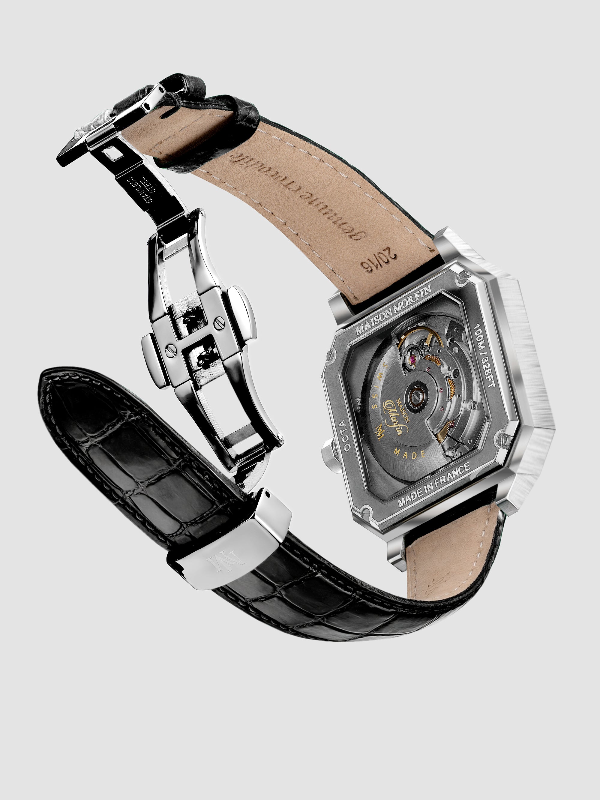 Le cuir du bracelet de la Octa est rembordé selon un savoir-faire genevois d’exception. Cette technique artisanale consiste à replier le cuir sur lui-même afin d’offrir des contours parfaitement lisses et durables. Elle garantit une excellente finition, très confortable au poignet. Héritée de la tradition artisanale suisse, elle incarne l’exigence et la précision qui définissent Maison MORFIN.
